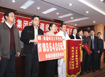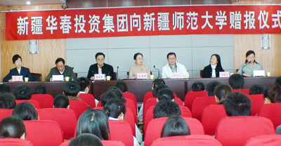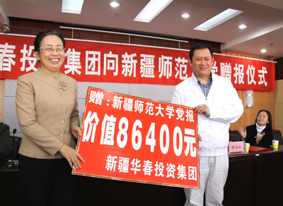在陽春3月的25日下午,新疆華春投資集團(tuán)向新疆師范大學(xué)的贈報儀式在新疆師大教學(xué)主樓學(xué)術(shù)報告廳隆重舉行。華春投資集團(tuán)首期出資現(xiàn)金將近9萬元,訂購全年度的黨報《新疆經(jīng)濟(jì)報》300份,贈送給新疆師范大學(xué)的教師們,方便教師們及時學(xué)習(xí)了解黨的路線、方針、政策及國內(nèi)外各項重大信息。新疆華春投資集團(tuán)為推進(jìn)新疆教學(xué)人才的培育、為新疆和諧社會的構(gòu)建,從而奉獻(xiàn)出新疆華春投資集團(tuán)的一份愛心。