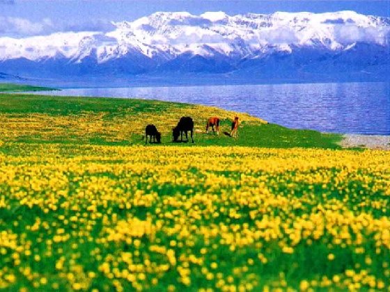 賽里木湖,位于新疆博爾塔拉蒙古自治州境內(nèi)。賽里木湖古稱“乳海”,清代曾在湖的東岸設(shè)鄂勒著依圖博木軍臺,即三臺,因此又稱“三臺海子”。它東西長30公里,南北寬27公里,水域面積458平方公里,最深處91米,蓄水總量210億立方米,湖面海拔2073米,是新疆維吾爾自治區(qū)海拔最高、面積最大的高山湖。