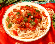 拉條子常用的拌菜是過油肉,雞蛋炒西紅柿,辣子炒羊肉,芹菜肉片等等。拉條子消暑耐饑,在炎熱的夏天,若早晨美美吃上一頓拉條子,到晚間也不覺得饑餓。更為有趣的是,把拉條子切成三、四厘米長的小段,和油、羊肉、大蔥、西紅柿、辣椒等爆炒,即成爆炒面,其風(fēng)味與拉條子又迥然不同了。