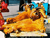 在新疆與北京烤鴨媲美的名貴菜肴就是烤全羊,是維吾爾族的一大傳統(tǒng)名肴。在烏魯木齊、喀什、和田等地的巴扎爾都可聞到它特有的香味。烤全羊不僅是街頭的風(fēng)味小吃,而且也是維吾爾人招待貴客的上等佳肴,現(xiàn)在也成為高級筵席中的