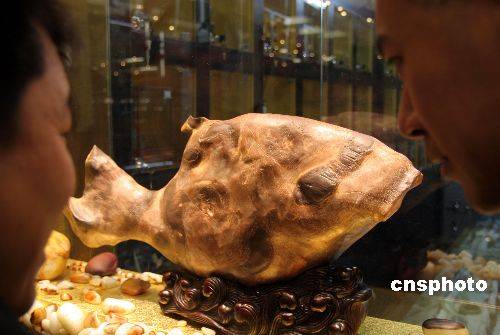 近日,北京愛(ài)家國(guó)際收藏品交流市場(chǎng)的一商戶,展出一款來(lái)自新疆天山南部一干枯的湖底中發(fā)現(xiàn)的形似“魚(yú)”的罕見(jiàn)天然五彩奇石,形象逼真、色彩斑瀾,長(zhǎng)72.8cm、高33cm,重達(dá)20多公斤。此石被專家們譽(yù)為天下第一奇石,其價(jià)值約億元人民幣。展出3天以來(lái),吸引了不少中外收藏愛(ài)好者。