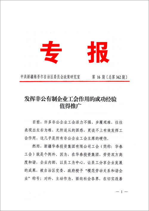 近日,自治區(qū)黨委政研室對新疆華春投資集團(tuán)工會委員會的典型成功經(jīng)驗進(jìn)行了深入調(diào)研,發(fā)了題為《發(fā)揮非公有制企業(yè)工會作用的成功經(jīng)驗值得推廣》的專報。結(jié)論是:新疆華春工會的實踐證明,非公企業(yè)工會有干不完的工作,不是可有可無,而是大有可為!這是在自治區(qū)黨委這個層面上,首次對全疆非公有制企業(yè)工會的肯定。
