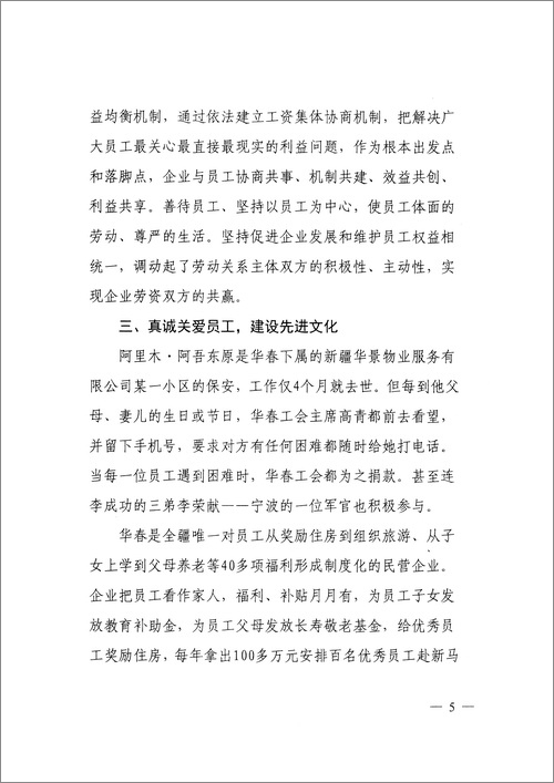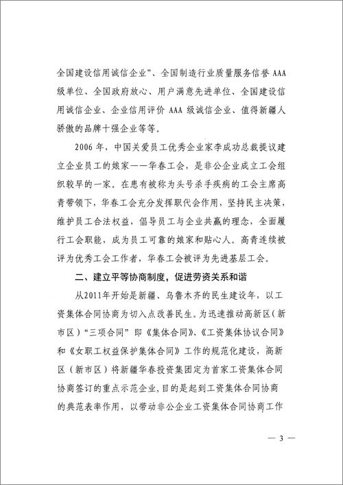 專報認(rèn)為:新疆華春工會就是個例外。對內(nèi),建設(shè)規(guī)范有序、公正合理、互利共贏、和諧穩(wěn)定的社會主義新型勞動關(guān)系,促進(jìn)企業(yè)發(fā)展,維護(hù)員工權(quán)益,率先簽訂工資集體協(xié)商合同,勞資雙方高度和諧,實現(xiàn)企業(yè)與員工的雙贏,被自治區(qū)黨委、政府授予“模范勞動關(guān)系和諧企業(yè)”稱號;