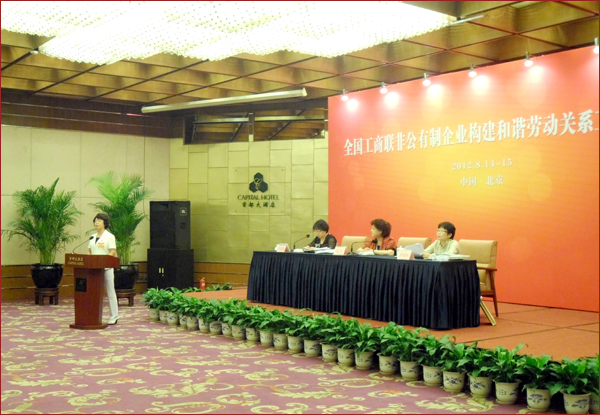 為進(jìn)一步貫徹落實中央16號文件精神、推動非公有制企業(yè)構(gòu)建和諧勞動關(guān)系,由全國工商聯(lián)主辦的、由中央統(tǒng)戰(zhàn)部、國務(wù)院法制辦、人力資源和社會保障部、全國總工會、中國勞動保障科學(xué)研究院等有關(guān)單位負(fù)責(zé)同志和各省級工商聯(lián)與全國非公有制企業(yè)代表140余人參加的全國非公企業(yè)構(gòu)建和諧勞動關(guān)系座談會,于8月14-15日在北京隆重召開。來自中國西部邊陲的新疆華春投資集團(tuán)的工會主席高青,代表李成功總裁作了大會典型發(fā)言,在大會中引起強(qiáng)烈反響,受到高度肯定。