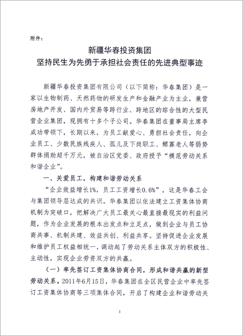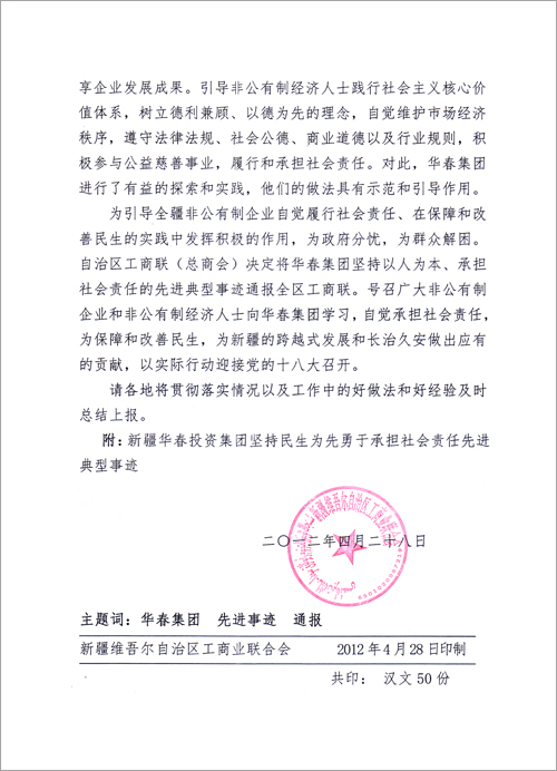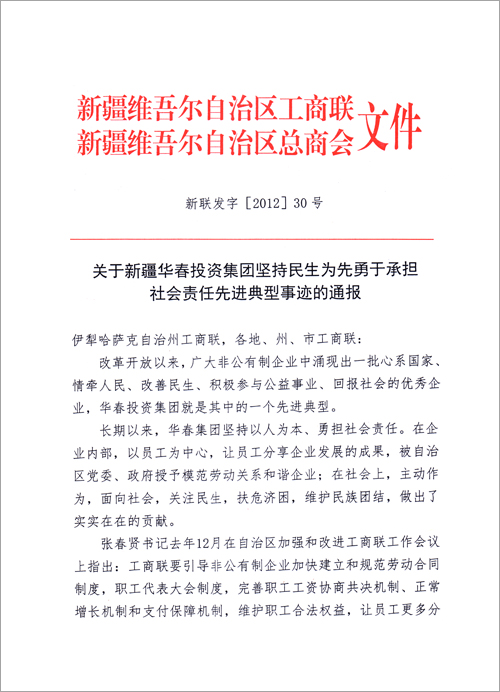 為引導(dǎo)全疆非公有制企業(yè)自覺(jué)履行社會(huì)責(zé)任,在保障和改善民生的實(shí)踐中發(fā)揮積極的作用,為政府分憂(yōu),為群眾解困。自治區(qū)工商聯(lián)(總商會(huì))決定將華春投資集團(tuán)堅(jiān)持民生為先勇于承擔(dān)社會(huì)責(zé)任先進(jìn)典型事跡通報(bào)全區(qū)工商聯(lián)。號(hào)召?gòu)V大非公有制企業(yè)和非公有制經(jīng)濟(jì)人士向華春投資集團(tuán)學(xué)習(xí),自覺(jué)承擔(dān)社會(huì)責(zé)任,為保障和改善民生,為新疆的跨越式發(fā)展和長(zhǎng)治久安做出應(yīng)有的貢獻(xiàn),以實(shí)際行動(dòng)迎接黨的十八大召開(kāi)。