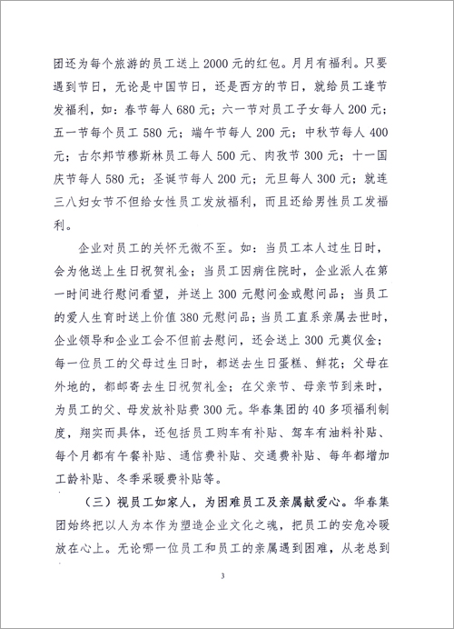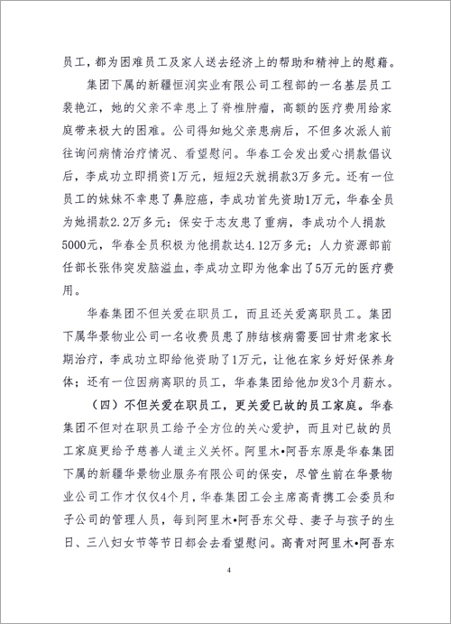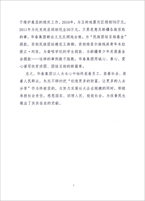 華春投資集團(tuán)成立17年來(lái),作為一個(gè)有社會(huì)責(zé)任感的民營(yíng)企業(yè),華春投資集團(tuán)履行責(zé)任,積極參與公益事業(yè),反哺社會(huì),感恩各界,是新疆首家參與社會(huì)主義新農(nóng)村建設(shè)的民企;是全疆向社會(huì)各界贈(zèng)送價(jià)值高達(dá)幾十萬(wàn)元的黨報(bào)、提供精神食糧的企業(yè);是全國(guó)首家資助第八屆全國(guó)民運(yùn)會(huì)新疆代表團(tuán)的民企;華春投資集團(tuán)是全疆對(duì)員工從獎(jiǎng)勵(lì)住房到組織旅游、從子女上學(xué)到父母養(yǎng)老等40多項(xiàng)福利形成制度化的民營(yíng)企業(yè)……