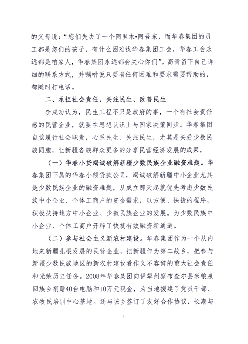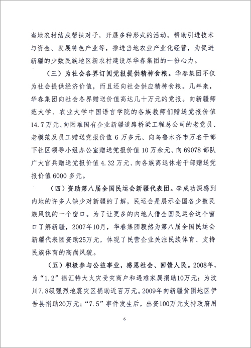 華春投資集團(tuán)的決策者李成功總裁認(rèn)為,民生工程不只是政府的事,非公企業(yè)要自覺(jué)履行社會(huì)職責(zé),關(guān)注民生,心系民生,全力改善民生。李成功總裁在思想認(rèn)識(shí)上與國(guó)家決策同步,不但讓企業(yè)員工分享企業(yè)發(fā)展的成果,而且讓新疆各族群眾分享非公經(jīng)濟(jì)發(fā)展的成果,這已成為華春投資集團(tuán)的常態(tài)。