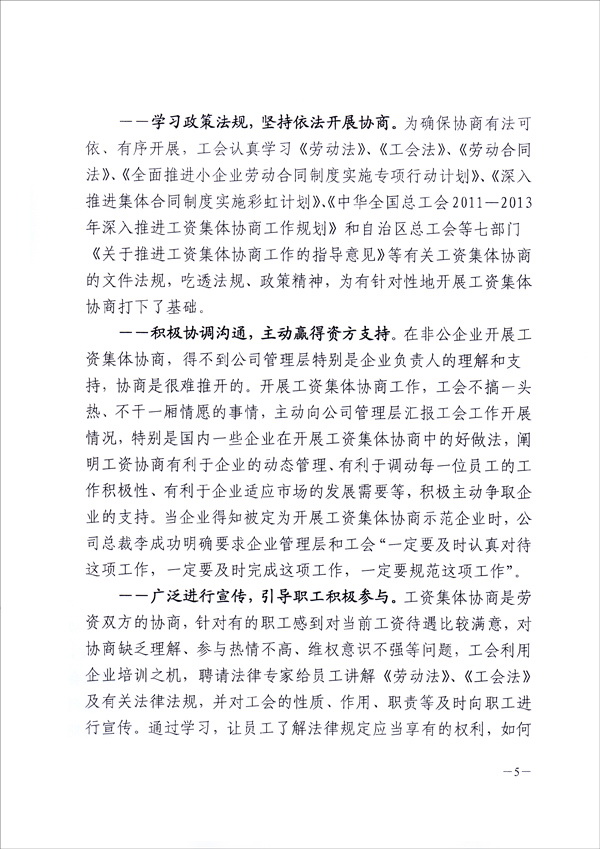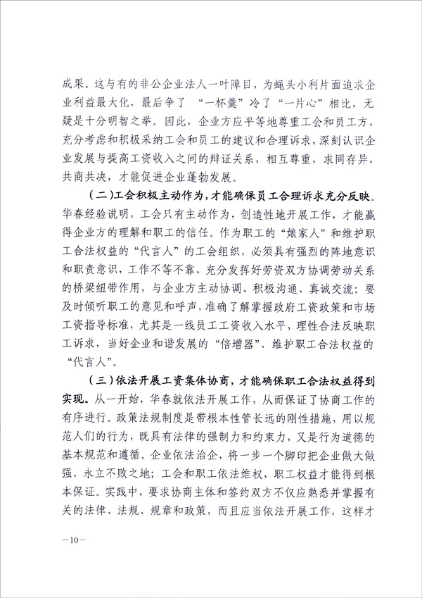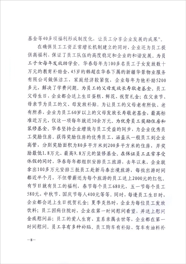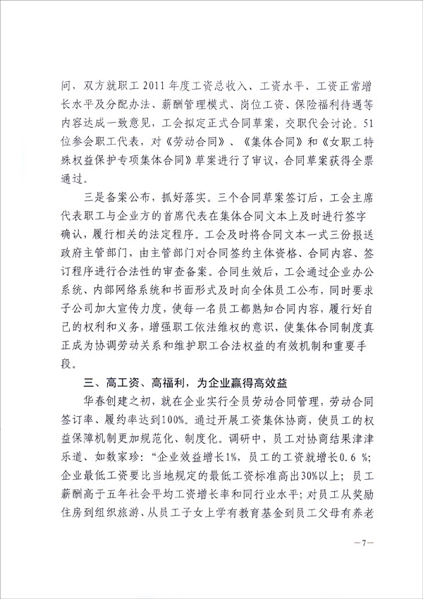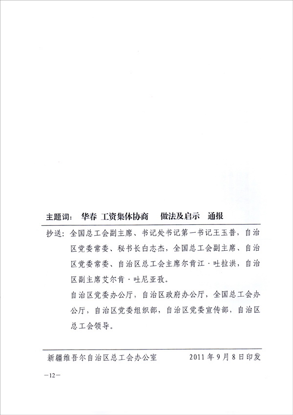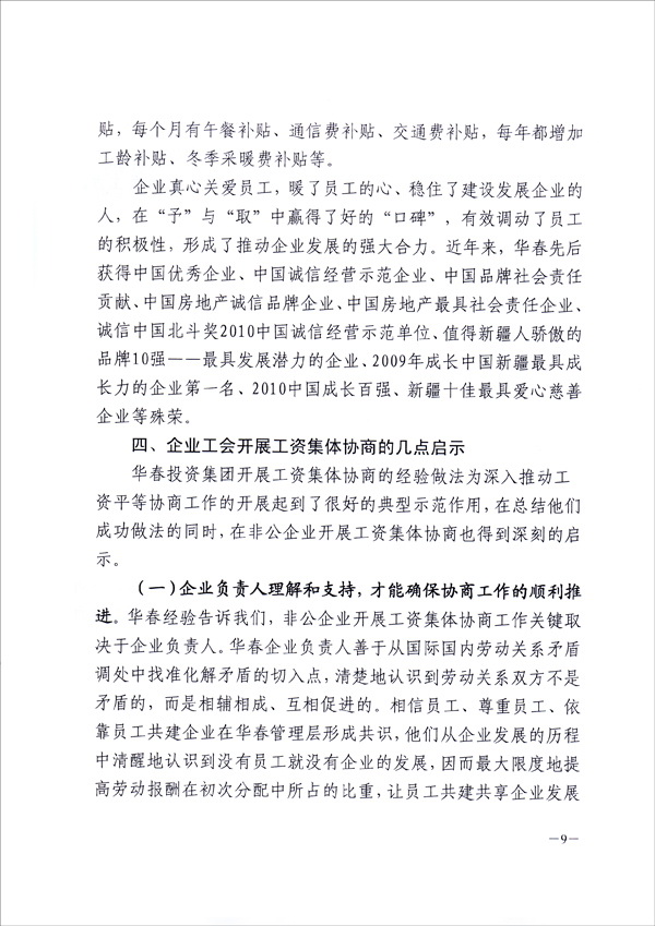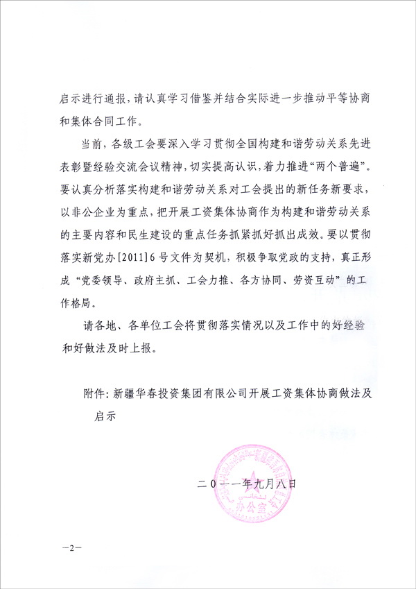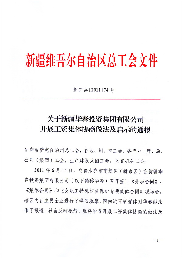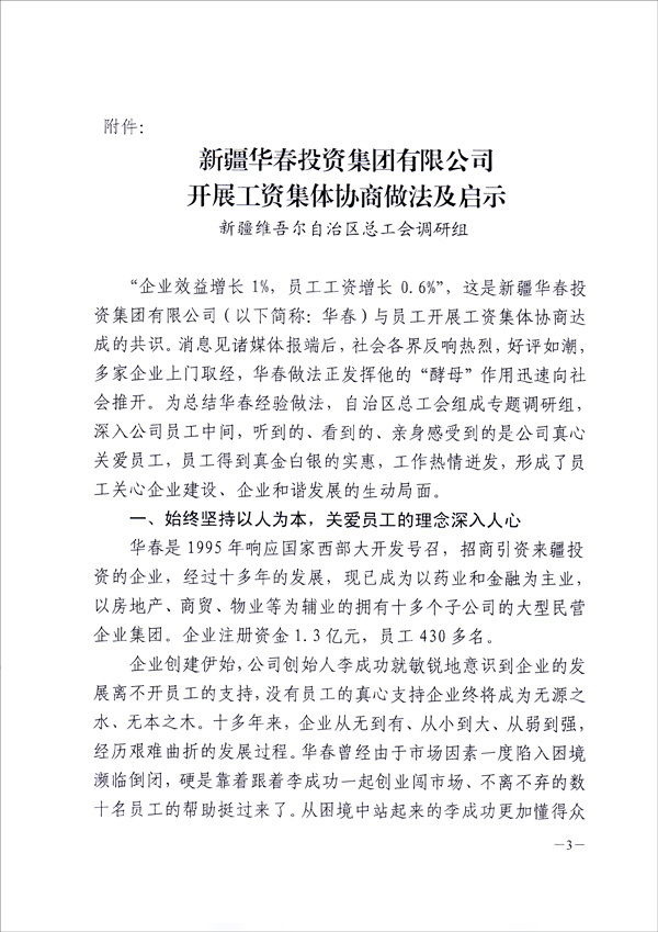為在全疆推進(jìn)工資集體協(xié)商、構(gòu)建和諧勞動關(guān)系,新疆維吾爾自治區(qū)總工會于9月8日向全疆各地州、各產(chǎn)業(yè)、廳、局、公司集團(tuán)、生產(chǎn)建設(shè)兵團(tuán)、區(qū)直屬機(jī)關(guān)工會,正式下發(fā)了長達(dá)十幾頁的“關(guān)于新疆華春投資集團(tuán)有限公司開展工資集體協(xié)商做法及啟示的通報”的紅頭文件,要求全疆認(rèn)真學(xué)習(xí)與借鑒。
