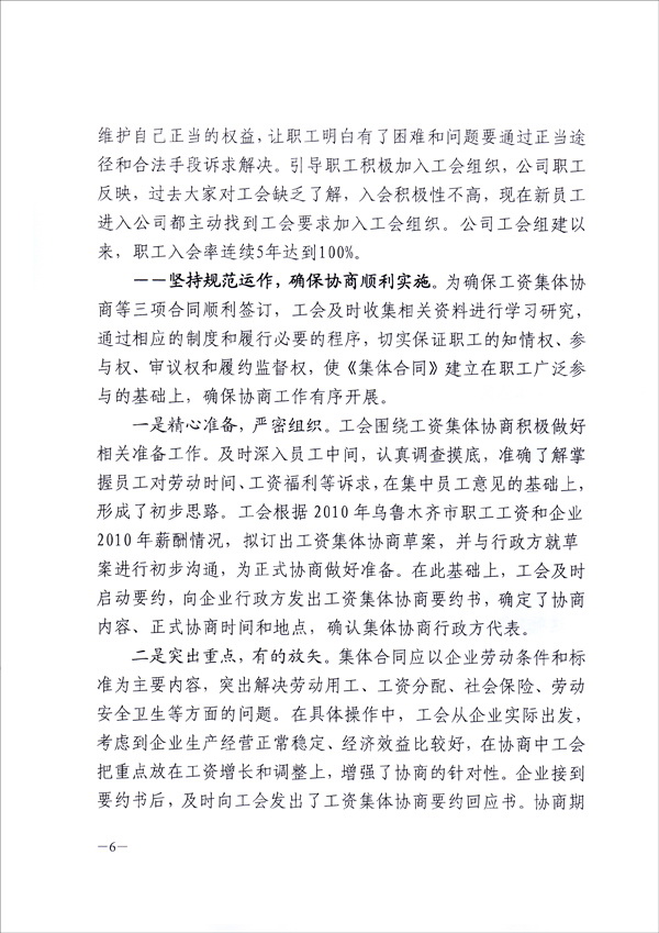由新疆維吾爾自治區(qū)總工會調(diào)研組撰寫的《新疆華春投資集團(tuán)有限公司開展工資集體協(xié)商做法及啟示》,對新疆華春投資集團(tuán)和華春工會給予了高度評價,認(rèn)為新疆華春投資集團(tuán)的做法與經(jīng)驗,為推動新疆工資集體協(xié)商工作的開展,起到了很好的典型示范作用。以期通過學(xué)習(xí)、借鑒華春經(jīng)驗,把開展工資集體協(xié)商作為構(gòu)建和諧勞動關(guān)系的民生建設(shè)重點任務(wù)抓出成效。