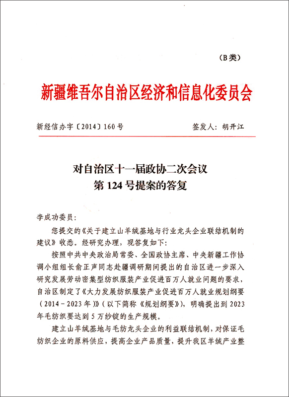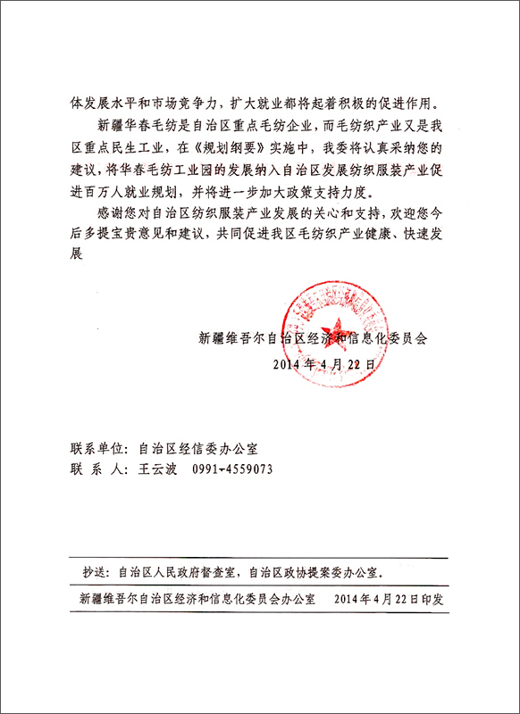 自治區(qū)經(jīng)信委在4月22日印發(fā)的新經(jīng)信辦字(2014)160號文件對自治區(qū)十一屆政協(xié)二次會議第124號提案的答復中,已明確了將華春毛紡工業(yè)園的發(fā)展納入自治區(qū)發(fā)展紡織服裝產(chǎn)業(yè)促進百萬人就業(yè)計劃,并將進一步加大就業(yè)政策支持力度。