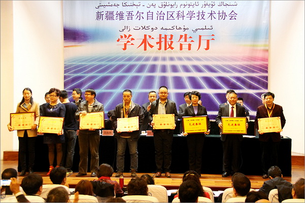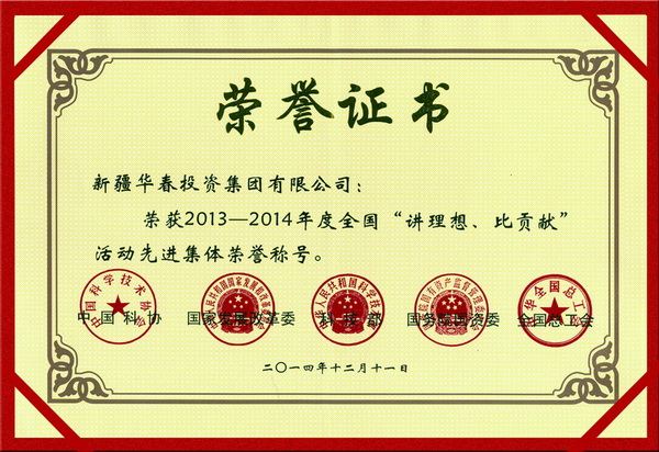 3月24日,在自治區(qū)科協(xié)全委會議隆重的頒獎儀式上,頒發(fā)了由中國科協(xié)、中華全國總工會、國務(wù)院國資委、發(fā)改委、科技部聯(lián)合表彰的2013-2014年度全國“講理想、比貢獻(xiàn)” 活動先進(jìn)集體和個人的獎牌和榮譽(yù)證書,新疆華春投資集團(tuán)和李成功總裁分別被授予全國“講理想、比貢獻(xiàn)”活動先進(jìn)集體和優(yōu)秀組織者榮譽(yù)稱號。