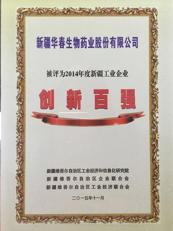 同時在新疆華春藥業(yè)全體同仁近一年的努力下,終于在這8家醫(yī)藥企業(yè)中占有一席,榮獲新疆工業(yè)企業(yè)“創(chuàng)新百強(qiáng)”稱號。進(jìn)一步增加了華春藥業(yè)的品牌價(jià)值,為藥業(yè)的宣傳與發(fā)展又增添了濃墨的一筆。