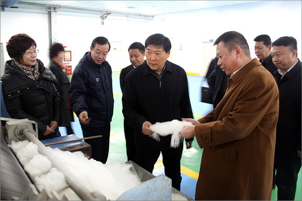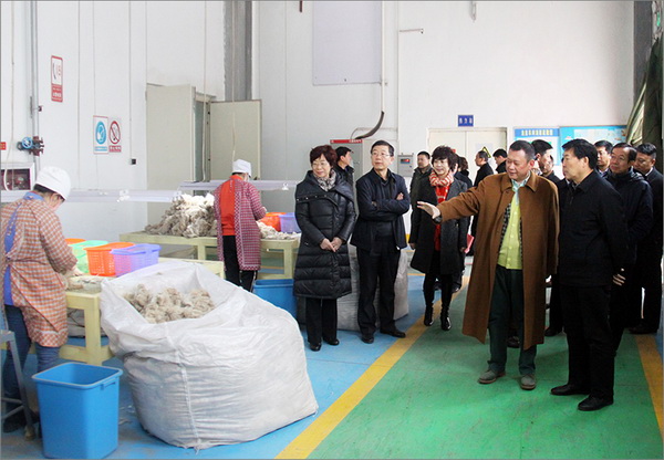 郭永輝一行從羊絨洗梳到羊絨染色、梳紡等羊絨服裝制品全程生產(chǎn)加工進(jìn)行了考察。新疆華春集團(tuán)李成功總裁與集團(tuán)高管及華春毛紡管理人員就華春毛紡生產(chǎn)經(jīng)營情況,向郭永輝一行進(jìn)行了匯報(bào)。郭永輝常委指出,要盡快培育自己的品牌,增強(qiáng)羊絨服裝制品的附加值。對(duì)華春毛紡被定為AAA國家級(jí)旅游景區(qū)以來的工作給予了肯定。