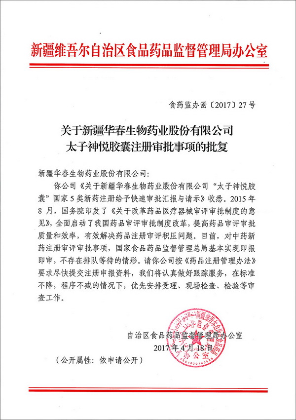 日前,自治區(qū)藥監(jiān)局對新疆華春生物藥業(yè)股份有限公司關(guān)于抗抑郁新藥太子神悅膠囊注冊審批事項作出批復:國家食品藥品監(jiān)督管理總局基本實現(xiàn)即報即審,不存在排隊等待的情形。請你公司按《藥品注冊管理辦法》要求盡快提交注冊申報資料,我們將認真做好跟蹤服務(wù),在標準不降,程序不減的情況下,優(yōu)先安排受理、現(xiàn)場檢查、檢驗等審查工作。