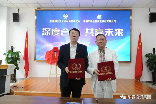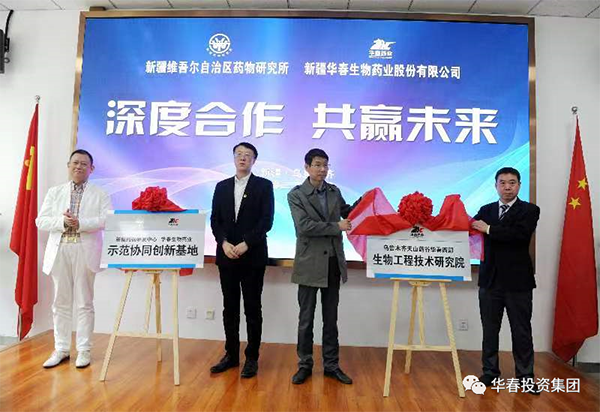 新疆華春生物藥業(yè)股份有限公司與自治區(qū)藥物研究所于4月 28日簽訂了深度合作協(xié)議,就雙方合作組建的新疆藥物研發(fā)中心華春生物藥業(yè)示范協(xié)同創(chuàng)新基地、烏魯木齊天山藥谷華春西部生物工程技術(shù)研究院舉行了揭牌。旨在更深層次多方面充分發(fā)揮雙方優(yōu)勢,強強聯(lián)合,實現(xiàn)共贏。華春投資集團董事局李成功主席與自治區(qū)藥物研究所邢建國所長以及雙方的相關(guān)管理人員參加了簽約揭牌儀式。