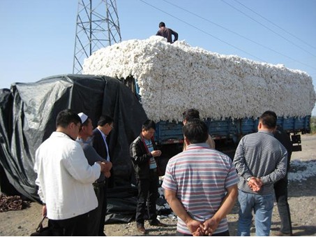 軋花廠工作人員在附近的一個(gè)棉花交易市場(chǎng)做調(diào)研