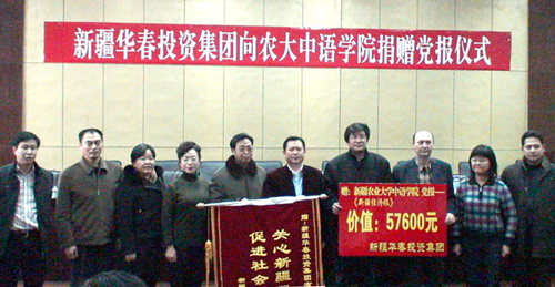 在2008年開啟之際的1月2日,新疆華春投資集團(tuán)有限公司為了支持新疆農(nóng)業(yè)大學(xué)中國語言學(xué)院的老師與同學(xué)們,方便及時(shí)學(xué)習(xí)黨的路線、方針、政策,從而及時(shí)了解國內(nèi)外各項(xiàng)重大信息,因此新疆華春投資集團(tuán)出資現(xiàn)金57600元訂購2008年全年的《新疆經(jīng)濟(jì)報(bào)》200份,贈(zèng)送給新疆農(nóng)業(yè)大學(xué)中國語言學(xué)院,為新疆雙語人才的培育、為新疆和諧社會(huì)的構(gòu)建,奉獻(xiàn)出新疆華春投資集團(tuán)的一片愛心。