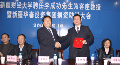 儀式上,華春投資集團為新疆財大工商管理學院捐助了10臺筆記本電腦。李成功先生說,接過這個教授聘書,覺得沉甸甸的,這不僅僅是一份聘書,而是一份對教育事業(yè)盡力的社會責任。華春投資集團還將于2010年開始在5年時間內(nèi),對新疆財經(jīng)大學50名家境貧寒的學生每人資助3000元、50名品學兼優(yōu)的學生每人資助5000元,還準備為該?;I建一座教學樓。作為新疆財經(jīng)大學的客座教授,有責任為我們新疆財經(jīng)大學的教書育人事業(yè)貢獻一份心力。