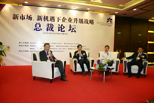 圖為:香港理工大學院長高級顧問曾慶忠在論壇上主持由新疆華春投資集團有限公司董事局主席兼總裁李成功、西子聯(lián)合控股有限公司董事長王水福、賽維LDK太陽能有限公司董事長兼總裁彭小峰參加的《強強合作企業(yè)騰飛戰(zhàn)略》專題討論。