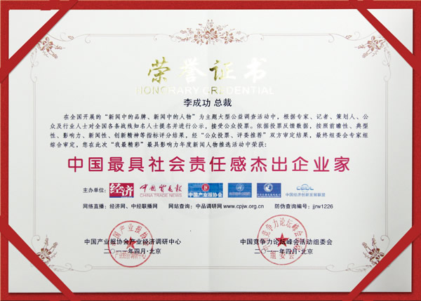 于4月23-24日在北京隆重召開的“2011中國企業(yè)競爭力年會暨誠信與發(fā)展高峰會”上,由中國產(chǎn)業(yè)經(jīng)濟(jì)調(diào)研中心發(fā)布了《2011中國最具競爭力企業(yè)年度排行》和《中國經(jīng)濟(jì)最具影響力時代新聞人物》,新疆華春投資集團(tuán)榮獲“引領(lǐng)中國民營經(jīng)濟(jì)尚佳典范品牌”、總裁李成功榮獲“中國最具社會責(zé)任感杰出企業(yè)家”稱號。