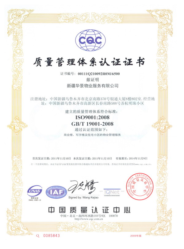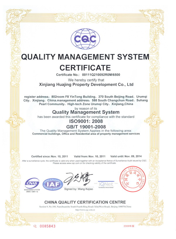 為了能夠長(zhǎng)期、穩(wěn)定地向業(yè)主提供滿意的服務(wù)和品質(zhì),華景物業(yè)始終堅(jiān)持以創(chuàng)新科技求發(fā)展,以高質(zhì)量求生存,推行先進(jìn)的管理理念,建立最新的管理質(zhì)量體系作為企業(yè)宗旨,使公司能夠早日與國(guó)際質(zhì)量體系接軌。2011年在公司領(lǐng)導(dǎo)的大力倡導(dǎo)下,在各職能部室的全力配合下,由中國(guó)檢驗(yàn)認(rèn)證集團(tuán)新疆有限公司委派的審核組成員一行五人,依據(jù)GB/T19001-2008標(biāo)準(zhǔn)、相關(guān)法律法規(guī)的要求,對(duì)華景物業(yè)公司認(rèn)證范圍內(nèi)所涉及的商業(yè)樓、寫字樓和住宅小區(qū)的物業(yè)管理服務(wù)過程進(jìn)行了現(xiàn)場(chǎng)審核,經(jīng)過為期兩天的現(xiàn)場(chǎng)審核,審核組成員對(duì)華景物業(yè)ISO9000管理體系建立的有效性和符合性給予了肯定,并與2011年11月10日正式取得了由中國(guó)質(zhì)量認(rèn)證中心頒發(fā)的質(zhì)量管理體系認(rèn)證證書。