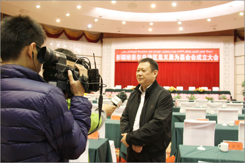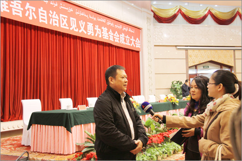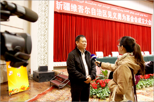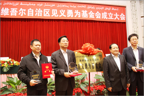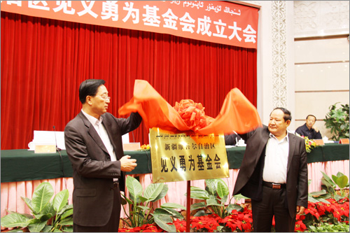 和新疆見(jiàn)義勇為基金會(huì)首屆理事長(zhǎng)張國(guó)梁為基金會(huì)揭牌