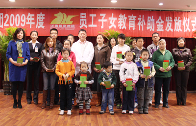 華春集團總裁李成功為員工子女發(fā)放教育補助金。