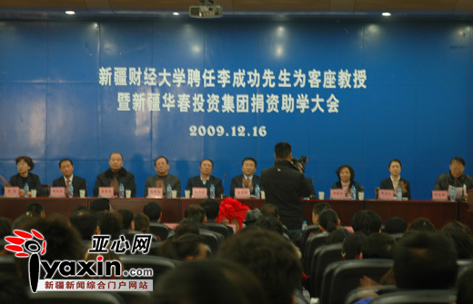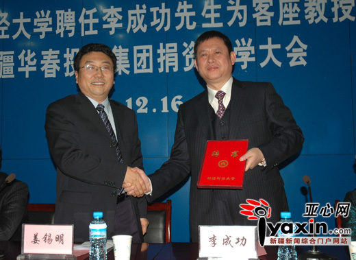 亞心網(wǎng)iyaxin.com訊(本網(wǎng)記者 邱鳴)12月16日下午,新疆華春投資集團(tuán)董事局主席兼總裁李成功接受了新疆財(cái)經(jīng)大學(xué)副校長(zhǎng)姜錫明頒發(fā)的聘書,成為新疆財(cái)經(jīng)大學(xué)客座教授。