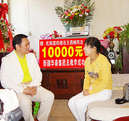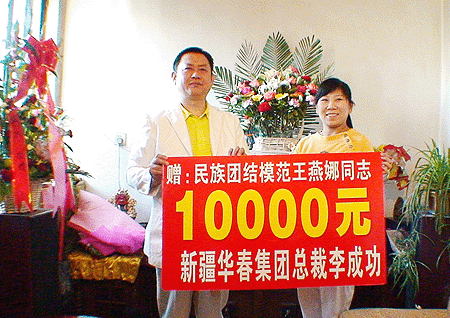 新疆華春投資集團(tuán)董事局主席兼總栽李成功給民族團(tuán)結(jié)模范王燕娜捐款1萬元
