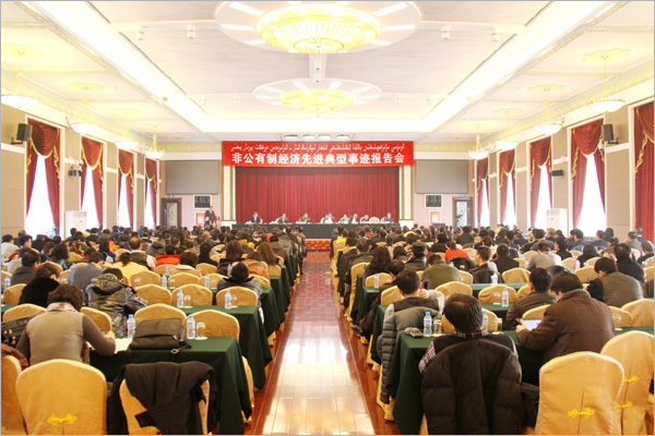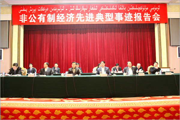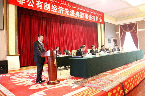 新疆隆重召開(kāi)非公有制經(jīng)濟(jì)先進(jìn)典型事跡報(bào)告會(huì)--新疆華春集團(tuán)有限公司李成功總裁在會(huì)上報(bào)告先進(jìn)典型事跡