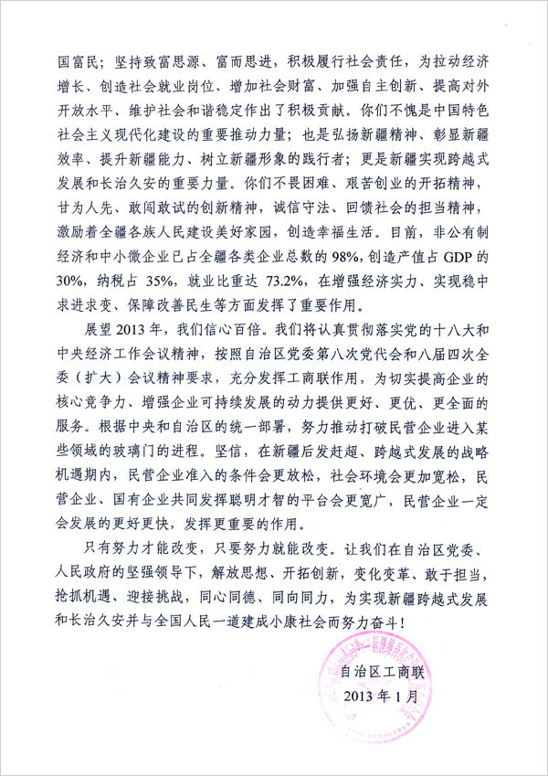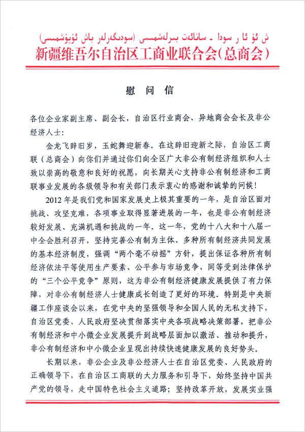 2013年1月17日,自治區(qū)工商聯(lián)黨組成員、自治區(qū)工商聯(lián)副主席努爾力•尤努斯和自治區(qū)工商聯(lián)光彩辦副主任陳風(fēng)玫一行2人,春節(jié)前代表自治區(qū)工商聯(lián)主席及黨組來華春投資集團(tuán)慰問企業(yè)家副會長李成功總裁并送上自治區(qū)工商聯(lián)黨組的慰問信和鮮花。