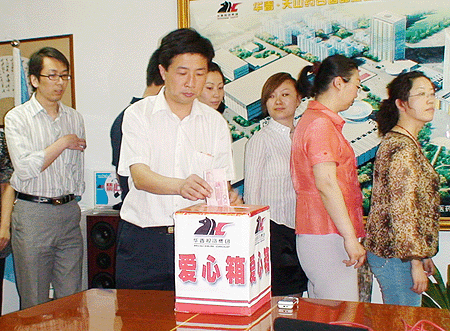 5月13日,新疆華春投資集團(tuán)企業(yè)工會和黨支部舉辦了向四川省汶川縣地震災(zāi)區(qū)群眾捐款救助活動,100多名員工在半個小時內(nèi)災(zāi)區(qū)捐款17975元。