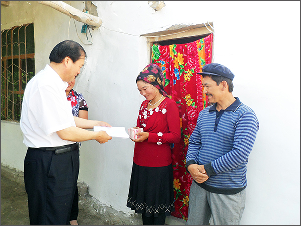 接著,到貧困戶吾布力•馬木提家去慰問。戶吾布力•馬木提大兒子出車禍去世,留下一個(gè)小孫子,因妻子患病花費(fèi)較大而致貧。李湘林副主席把華春資助的2萬元錢送到他妻子的手上,他妻子手捧著錢淚流滿面,她可能一生都沒有一次拿過這么多的錢,對(duì)于這樣一個(gè)病人,得到的是救命的錢!