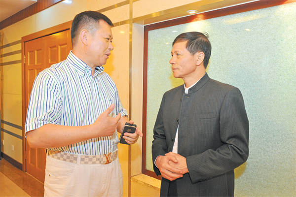 新疆華春投資集團有限公司董事局主席兼總裁李成功(左)與新疆法制報社社長蔡宇知探討企業(yè)法人治理結(jié)構(gòu)話題。