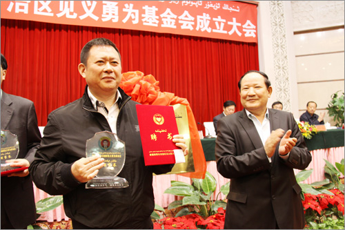 自治區(qū)見義勇為基金會成立大會于2012年10月19日上午在新疆人民會堂多功能廳隆重舉行,新疆華春投資集團董事局主席兼總裁李成功先生當選自治區(qū)見義勇為基金會首屆理事會副理事長,自治區(qū)副主席、政法委副書記賈帕爾•阿比布拉為李總裁頒發(fā)了副理事長證書和座牌。