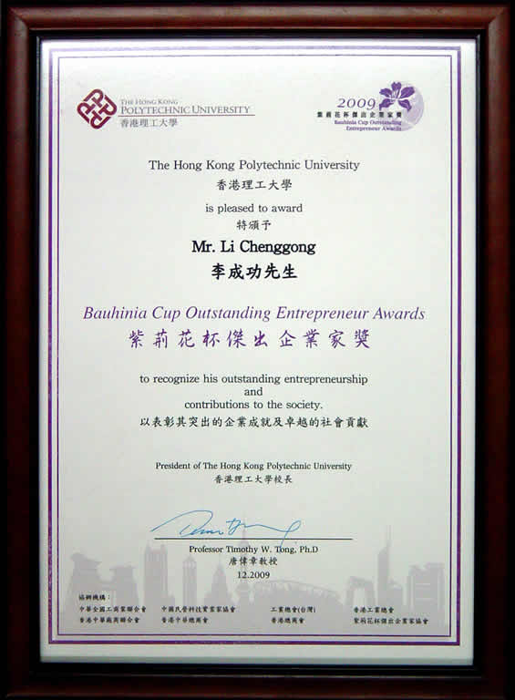 “2009中國十大誠信企業(yè)家”榮譽證書