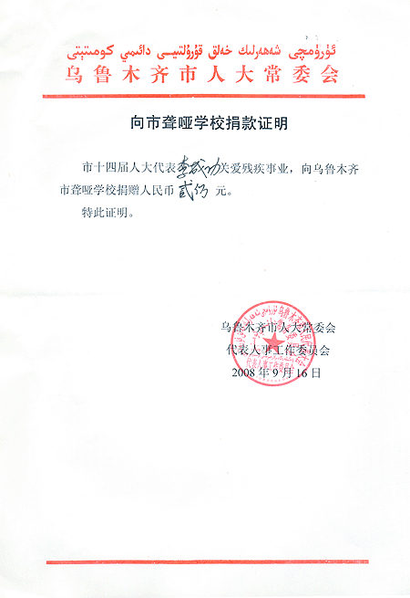 市人大出具的給聾啞學(xué)校捐款證明