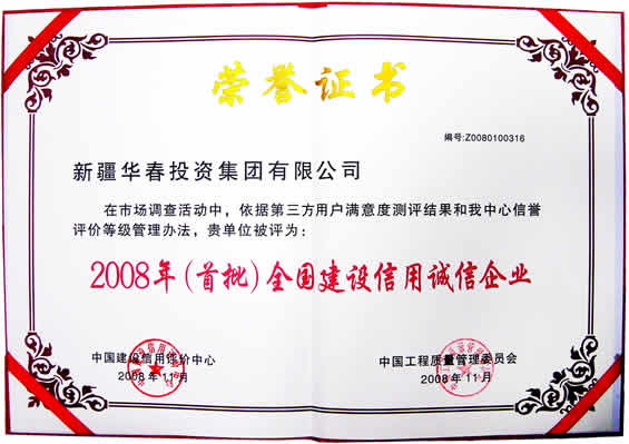 “2008年首批全國建設(shè)信用誠信企業(yè)”榮譽(yù)證書